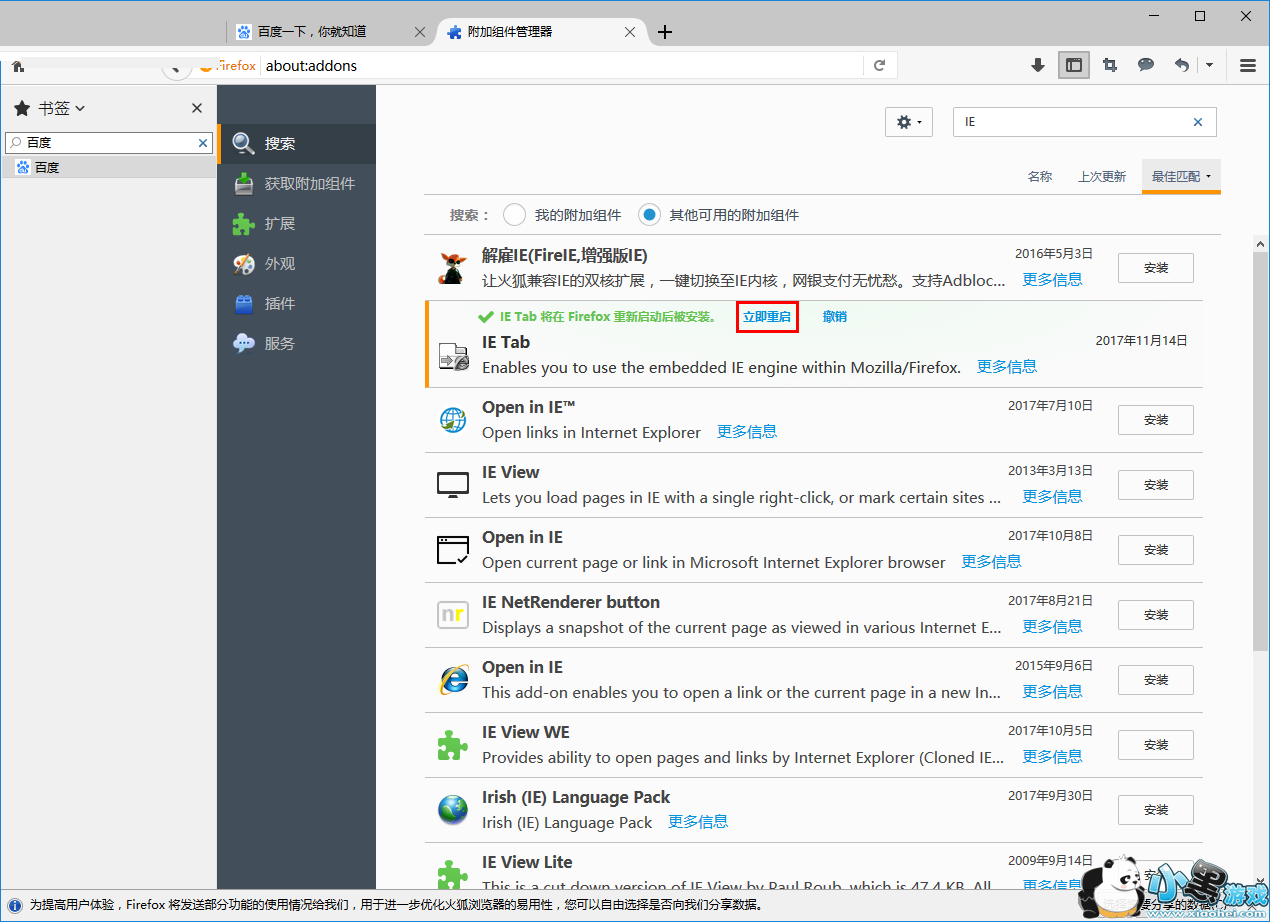 5、紧接着,其提示需要火狐浏览器重启后被安装,我们点击“立即重启”按钮。