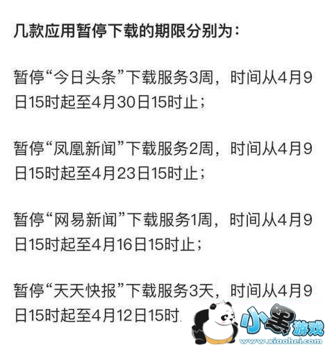 据悉,“为依法规范传播秩序,各互联网应用商店暂停今日头条、凤凰新闻、网易新闻和天天快报四款移动应用程序的下载服务”。