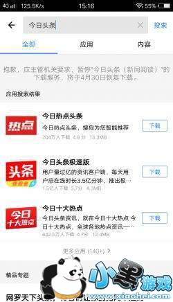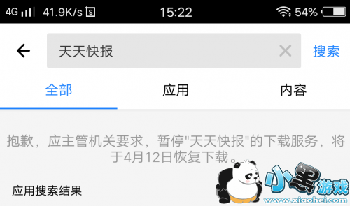 15时过后,在腾讯应用宝内搜寻“今日头条”,结果显示:抱歉,应主管机关要求,“今日头条(新闻阅读)”的下载服务,将于4月30日恢复下载。