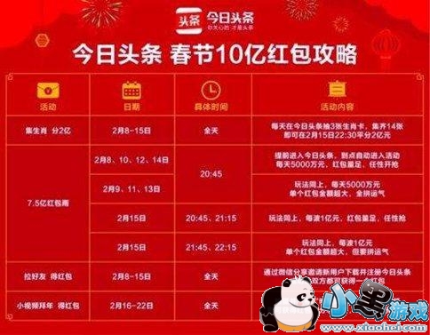 今日头条从今天8日一直到22日都会有红包活动,这个春节期间将会送出10一红包。不过今日头条的10亿红包包含了很多活动在里面,可能有很多下伙伴知道的并不全,所以这里给大家介绍一下今日头条春节10亿红包的虽有活动时间和攻略,保证让你一个红包都不会错过,至于说能抢多少到手那就要看你的运气啦,赶快来看看春节红包攻略吧。