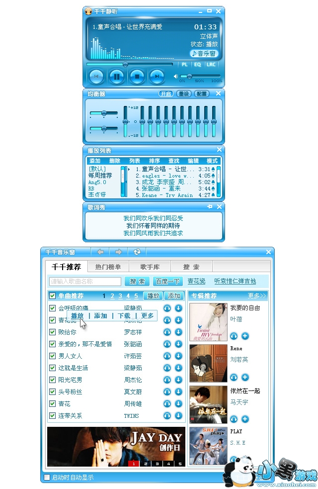 此外,还有更多深受用户喜爱的人性化设计:支持音乐媒体库、多播放列表和音频文件搜索;贴心的播放跟随光标功能;多种视觉效果享受,支持视觉效果、歌词全屏显示及多种组合全屏显示模式;可对播放列表中的歌曲进行评级和排序操作;千千音乐窗每日更新精选歌曲推荐,各类榜单随意选择,还可直接添加到播放列表中试听;支持专辑封面编辑和自制皮肤的更换;同时具有磁性窗口、半透明/淡入淡出窗口、窗口阴影、任务栏图标、自定义快捷键、信息滚动、菜单功能提示等多种个性化功能。