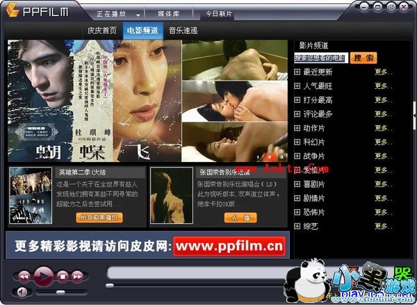 ppfilm 采用国际领先的技术,支持大规模影视点播。 web2.0架构更让您畅所欲言,享受当家作主的乐趣,“看大家想看”更热门,更流畅,更称心!