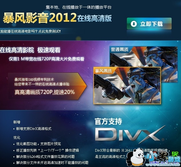 新增 新增支持DivX高清格式 优化 优化截图功能,支持图片预览 修正播放列表“上一个/下一个”操作逻辑 解决部分h264格式文件播放花屏的问题 解决部分文件未开启高清加速时不能播放的问题
