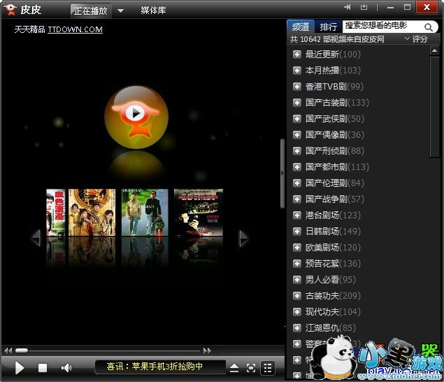 皮皮高清影视是全球互联网上最清晰流畅的在线影视播放平台,安装本软件即可免费观看多达三万部高清电影、电视剧,且每天更新超过一百部。精彩高清影视,尽在皮皮网www.pipi.cn.”
