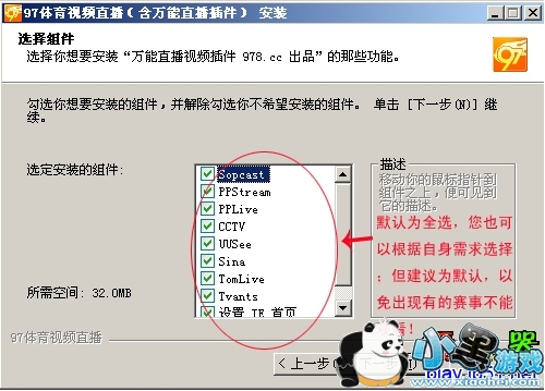 5)在出现“选择组件”的页面中,根据用户自身需要选择安装相应的组建,建议为默认,以免出现个别赛事不能播放的现象;