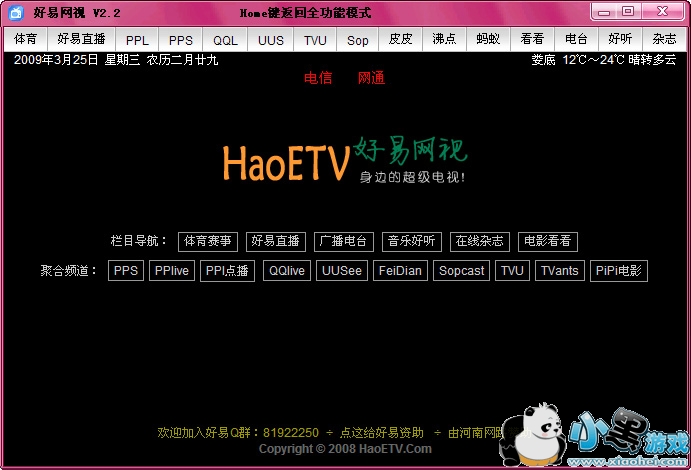 好易网络电视最新版:好易网视(haoetv)稳定高效的系统内核,聚合pps、pplive、qqlive、uusee、tvu、皮皮、沸点等主流16种网络电视软件,包含丰富的视频电影、电视资源,并有实时更新的体育直播节目,保证用户能够更加流畅的收看高清晰视频内容。软件操作简单,同时汇集了目前人气最高的8大视频站点(56.com,6.cn,Mofile,tudou.com,新浪,优酷,酷6),并在菜单收藏中收藏迷你网址导航,同时集成600多个电台以及在线听歌功能,好易是目前资源最多的集成网络平台。我们始终坚持永远免费!