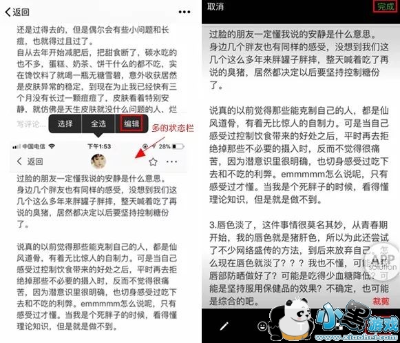 要注意的是:直接拼接的话,两张图的交界处会有一条状态栏。如果介意,可以在微信笔记里长按图片,选择「编辑」,裁剪一下,点击「完成」即可。