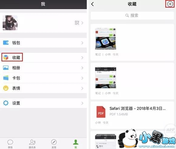 然后打开「微信」-「我」-「收藏」,点击右上角的「+」,这是微信自带的笔记功能。