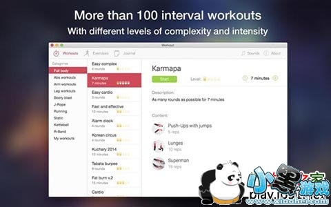 锻炼Mac版是一款Mac OS平台的身体锻炼辅助应用程序,锻炼Mac版可以帮助用户规划锻炼计划、指导练习动作,记录训练日志等。功能介绍该应用程序包含:- 超过100间隔锻炼不同的负荷和强度- 详细的说明。每一个训练细节中描述- 超过80演习的详细说明,一步一步的指导是由每个练习- 训练日记。保持你的记录,并与朋友分享- 能够创建自己的练习和锻炼这个程序是您的最佳间隔培训讲师。更新日志版本 1.0.1 中的新功能修复小错误