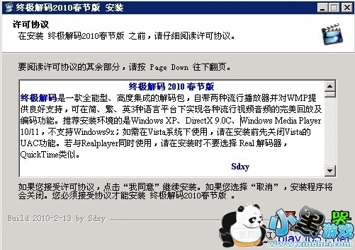 推荐安装环境的是Windows XP、DirectX 9.0C、Windows Media Player 10/11,不支持Windows9x;如需在Vista系统下使用,请在安装前先关闭Vista的UAC功能。若与Realplayer同时使用,请在安装时不要选择 Real 解码器,QuickTime类似。