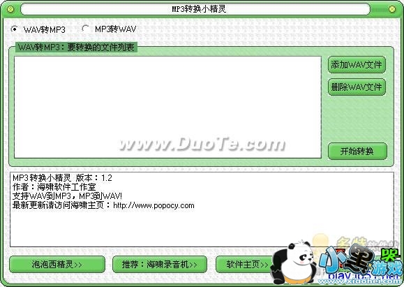 免费实用的MP3转换工具,海啸制作。转换核心采用非常著名的Lame MP3编码器,压缩速度快、质量好。软本件以文件列表的方式进行转换,免去了在命令行下直接使用LAME,让用户使用起来更加方便。 【软件功能】 它支持WAV->MP3 和 MP3->WAV 之间的相互转换,并且支持批量转化操作。【特别提示】1、转换后生成的新文件与源文件默认在同一目录中,文件名只是后缀名(即扩展名)不同;2、如果要转换的文件在光盘中,请先将该文件拷贝到硬盘上,再转换!