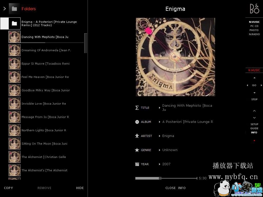 这是一个完全免费的音乐播放软件,不需要注册,下载安装完后需要在线认证!但是我们可以不须认证就可以使用,直接在防火墙里把它禁止连接网络就可以了,很简单。 超靓的音质!全黑色的界面,超级酷!左右两边的控制条来操控,绝对不是平常意义的播放器!太人性化了。这个软件音域很好,声音纯净!虽然是英文的,但是相信大家都能看明白!值得注意的是这个播放器的控制栏是隐藏在屏幕的左右两侧的,必须用鼠标滑到两侧,会出现一个三角形,点它就出来了,很人性化。装好了在右边的控制条里选择SETUP-SCAN扫描一下你电脑里面的MP3文件!里面可以选择你的MP3所在的磁盘目录,扫描完了就会在右侧的隐藏条里显示出来你所有的MP3文件,建议用Folders文件夹模式,找歌曲直接单击就可以了,很方便!听的时候点击右侧的INFO,可以查看MP3信息,还可以更改!第二次启动时,双击右侧控制栏里的N-musci,左侧就会弹出你的全部音乐。这个软件还带一个使用说明书,点右侧的GUIDE,选择中文,就可以看明白了!