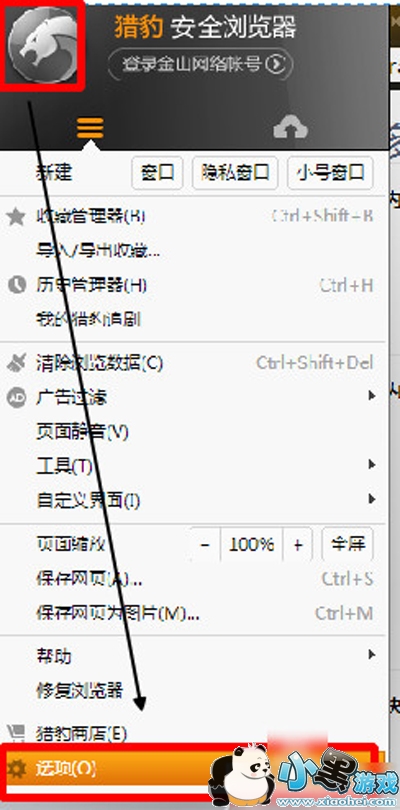 1、单击左上角的猎豹图像--选项,从而打开猎豹浏览器的选项设置;