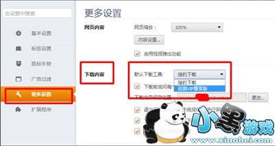 2、在更多设置选项下找到下载设置,单击默认下载工具后的猎豹下载,选择迅雷下载,因为我使用的是尊享版,所以选择尊享版下载。这样设置就完成了;