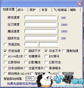 1、游戏速度调整 2、出刀速度调整 3、魔法速度调整 4、超级攻击 可以设置开启加速,超级不卡,攻击不卡,强制加速,右键骑马,esc骑马,幻影移动,幻影魔法,幻影攻击,过非法移动,过蓝字提示,看清暗杀等非常全面的功能