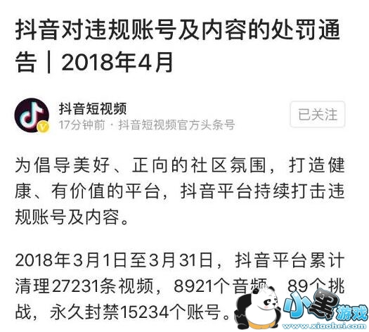 继被封禁评论后4月13日消息,继暂时关闭直播、评论功能,积极整改后,抖音方面今日发布对平台违规账号及内容的处罚通告。通告称,2018年3月1日至3月31日,抖音平台累计清理27231条视频,8921个音频,89个挑战,并永久封禁15234个账号。