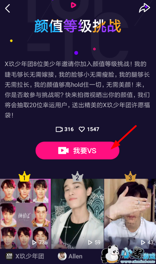 2、然后大家就可以通过其中的“我要VS”按钮,从而拍摄自己的视频,上传参加颜值等级挑战活动。
