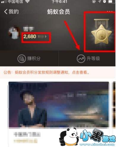 3.进入蚂蚁会员页面后,可以看到自己现在的积分以及此时的会员等级(小编是黄金会员)。点击 升等级 。积分是可以用来消费的,因此次这面所显示的积分为消费后的积分,而不是我们所获得的所有积分。