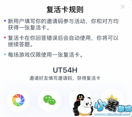 2、每次邀请一位新朋友,你和对方就各自获得一张复活卡。邀请码分享:UT54H,也就是说邀请码可以让双方再复活一轮哦。