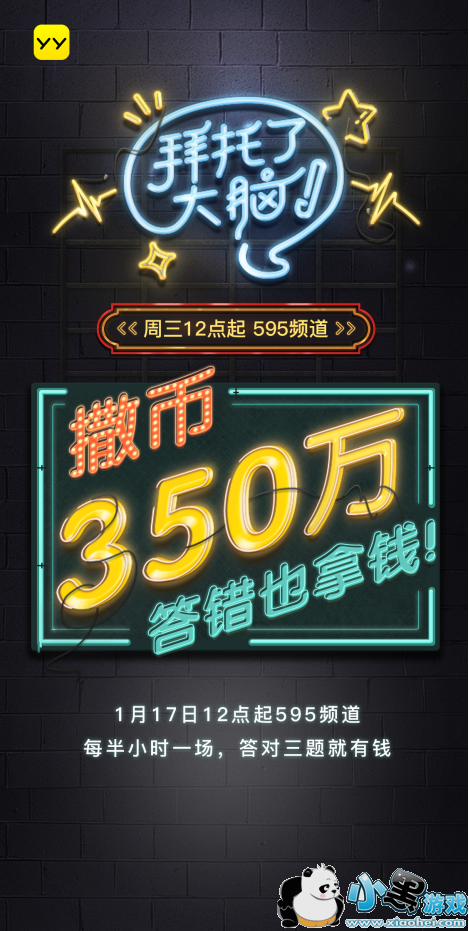 据悉,1月17日,YY答题《拜托了大脑》将从中午12点开始,每间隔半小时就有一场答题,全天共11小时22场奖金送不停。单场奖金6万元,晚上八点和九点两场奖金分别高达66万元,十点的奖池更是豪气开到了100万元。