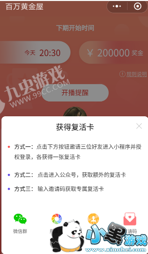 1、点击下方图片中按钮邀请三位好友进入小程序并授权登陆,各获得一张复活卡;