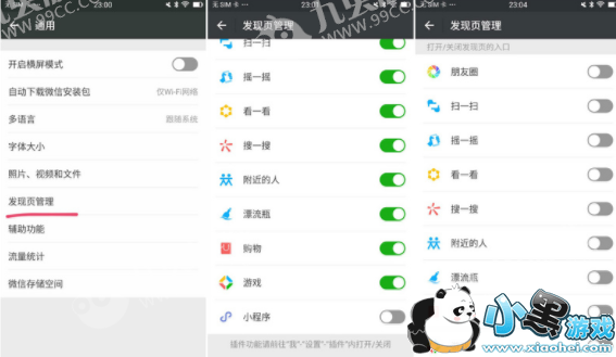 2.点开发现页管理后,会看到这里囊括了朋友圈、扫一扫、摇一摇、看一看、搜一搜、附近的人、漂流瓶、购物、游戏、小程序十大功能。而如今,只要滑动一下每个功能后方的胶囊型按钮,就可以立即关闭不想用的功能。