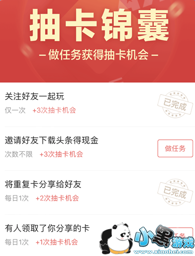 1、将重复的生肖卡或者成为弃卡分享给好友即为完成任务,集卡获得抽卡次数;