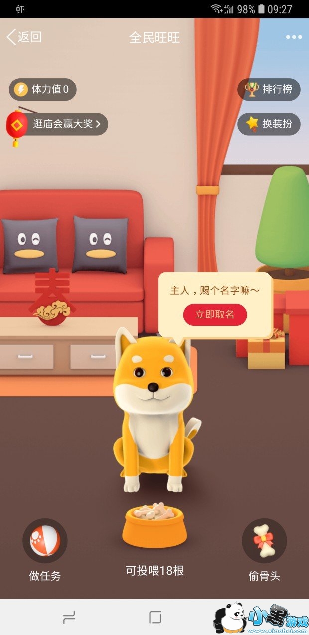 1.“旺旺的家”是活动主页,在这里你可以与狗狗互动:投喂狗狗,给狗狗装扮,查看狗狗的成长记录和排名,做任务、偷骨头等等。