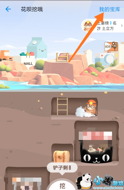 3.这时候,我们的小地鼠就会告诉我们消耗的铲子能使它前进多少步。如果我们挖到了优惠,就会弹出窗口具体告诉我们是什么优惠,当然我们也可以点击右上角的“我的宝库”。