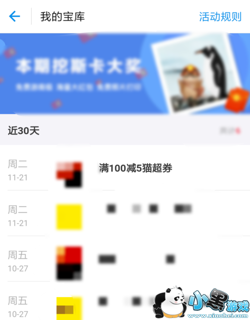 4.在“我的宝库”里面,我们可以看到我们近三十天内挖到过的所有优惠券或者是奖品,以及获得它们时的具体日期。