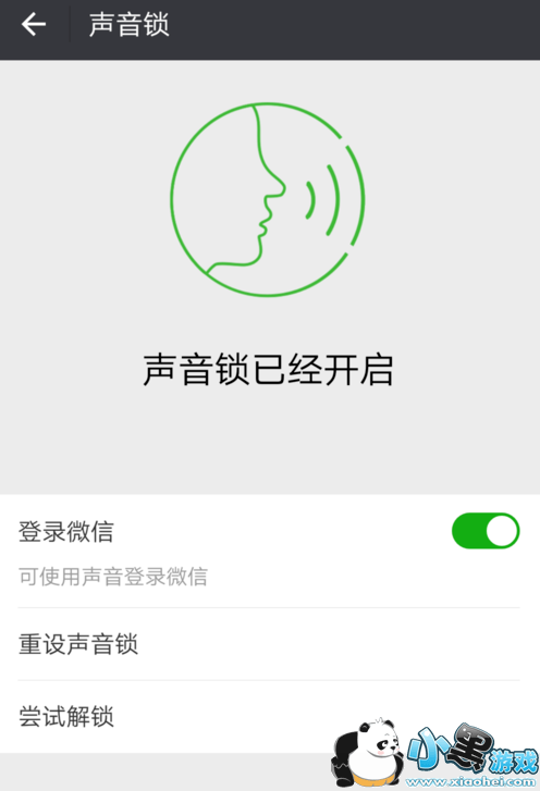 4.点击声音锁,进入到声音锁页面,页面显示着声音锁已经开启,还有微信登录、重设声音锁、尝试解锁的功能,如图