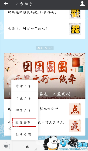 1.首先您可以关注微信公众号“王卡助手”,然后点击如下图所示的激活特权;