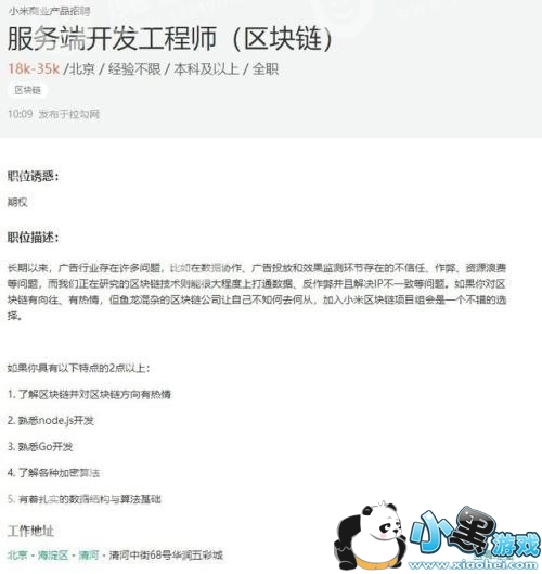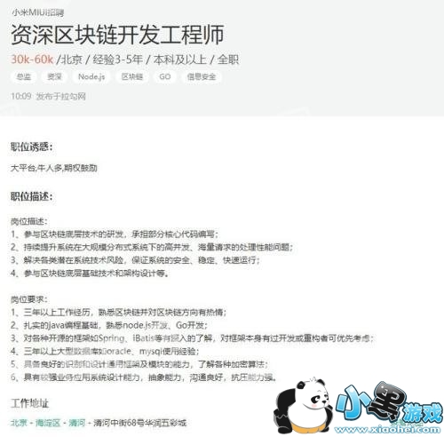 招聘信息显示,小米目前正在招聘资深区块链开发工程师、服务端开发工程师,标志着正式进入区块链领域。