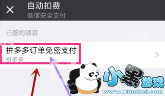 5、在自动扣费中,可以查看自己的微信支付签约的扣费项目,点击进入项目“拼多多订单免密支付”,如图所示;
