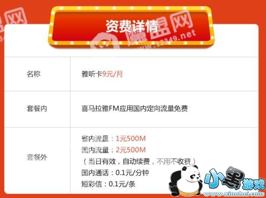 雅听卡套餐月费9元,套餐内提供喜马拉雅FM应用国内流量免费服务,套餐外省内流量1元500MB,国内流量2元500MB,国内通话0.1元/分钟,短彩信0.1元/条。