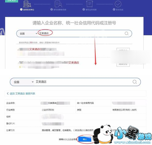 4.随后我们就进入了开始投诉的界面,这里需要输入你投诉的单位,比如艾美酒店,你输入后会发现全国有很多艾美酒店,找到你要投诉的那家单位。主要看哪个地址的艾美酒店。然后点击旁边的选择企业。页面就会跳转该企业的一些信息,你需要核对下,然后点击确认