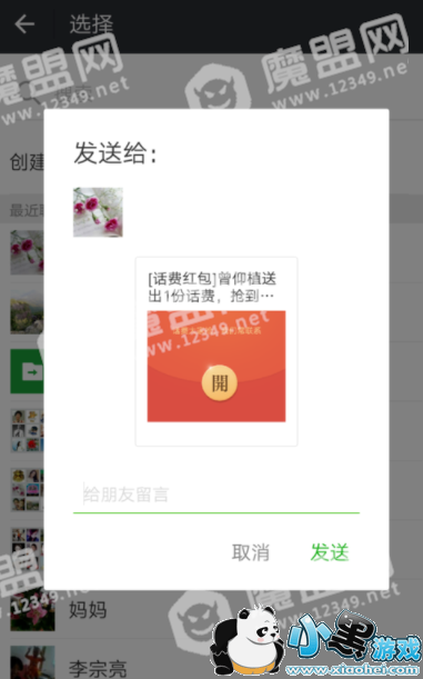 6.点击送出,弹出选择好友列表,点击好友发送,如图