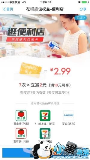 花呗便利店周卡只要花2.99,消费满10元就减2元。