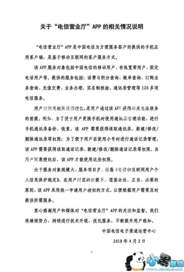4月3日,中国电信在回应中称,该APP服务对象包括中国电信的移动用户、有线宽带用户、固定电话用户等。提供的服务包括:话费与积分查询、账单查询、订购业 务查询、充值交费、业务办理、实名制核验、通讯录管理等120多项电信服务。用户对相关权限进行授权,是用户通过该APP获得相关电信服务的前提。