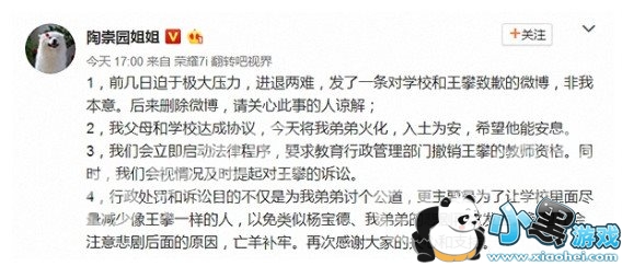 4月7日下午,微博“陶崇园姐姐”再度发声,表示此前向学校和王攀致歉的微博是“迫于极大压力,进退两难”,非自己本意。目前父母和学校已经达成协议,将弟弟火化,接下来,他们会立即启动法律程序,要求教育行政管理部门撤销王攀的教师资格,并视情况及时提起对王攀的诉讼。