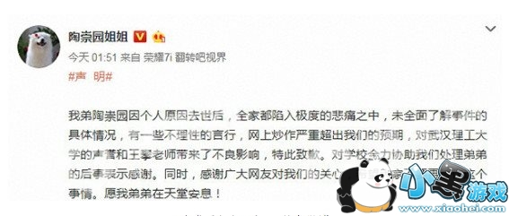 陶崇园坠楼身亡事件引发舆论关注。4月5日凌晨,账号为“陶崇园姐姐”的微博发布声明称,“希望大家不要再炒作这个事情。”并对武汉理工大学与王攀老师致歉。当天下午,这条声明被删除。