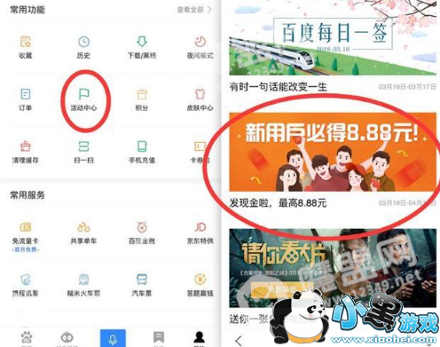 进入“活动中心”页面后,找到“发现金啦,最高8.88元”活动图片,点击进入。