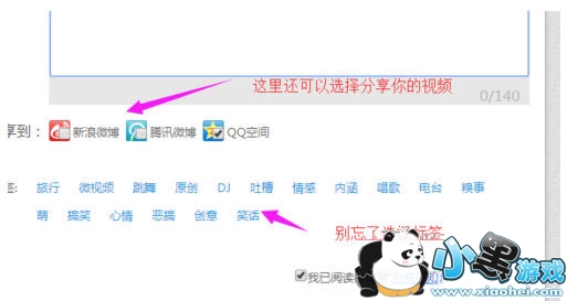 5、给视频做备注,然后还可以选择分享到你的圈子,最后别忘了选择标签,标签不选择是不能够提交的。