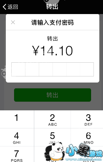 6.此时会弹出“请输入支付密码”的对话框,对话框上面还会显示转出的金额,我们输入支付密码就可以了。