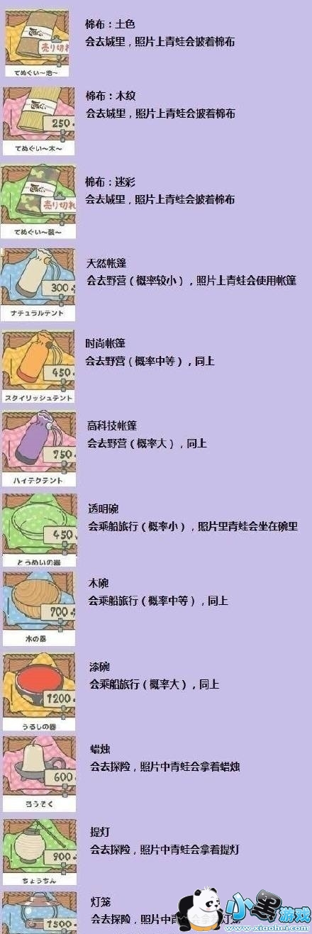 上图中的所有物品,也就是商城中的棉布,帐篷,碗,蜡烛,提灯,灯笼都是可以重复使用并永久存在的。除了上图中的物品,还有一个商城中的3000三叶草的幸运铃也是永久的,大家可以攒下三叶草把这些永久道具买好哦!之后会出现呱呱用着道具的写真的!