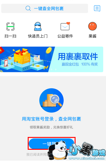 2.菜鸟裹裹打开之后,点击主界面上的“一键登录”按钮,输入你的淘宝账号和密码登录。