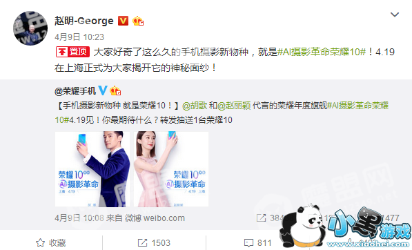 而此次荣耀10将会主打AI人工智能拍照,而且破天荒的胡歌和颖宝同时代言新品,相信这款新机一定给我们带来诸多意外的惊喜,期待19日新品发布会的到来