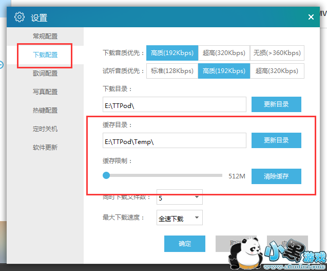 2、接着在“设置”的“下载配置”界面就可以看到天天动听缓存文件板储存位置了;
