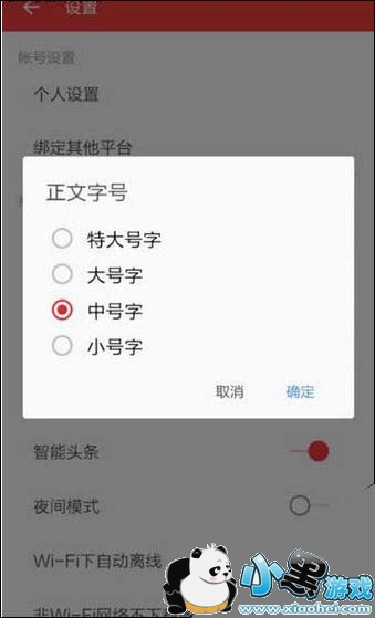 4、点击该功能以后,会弹出一个新的界面,在界面中会让你选择正文字号的大小,包括有特大号字、大号字、中号字、小号字等四个选项,选择你想要设置字号大小的那个字号即可,如下图。