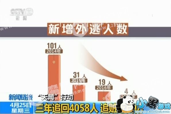 自“天网”行动启动到今年3月底,我国共从90多个国家和地区追回外逃人员4058人,其中,追回党员和国家工作人员800人,追赃近百亿元人民币。在强大震慑效应下,1300余人主动回国投案自首或被劝返回国,新增外逃人数从2014年101人降至2015年31人,再将至2016年19人,2017年4人,从2014年开始,新增外逃人员实现逐年下降,涉嫌违纪违法党员干部外逃势头得到有效遏制。